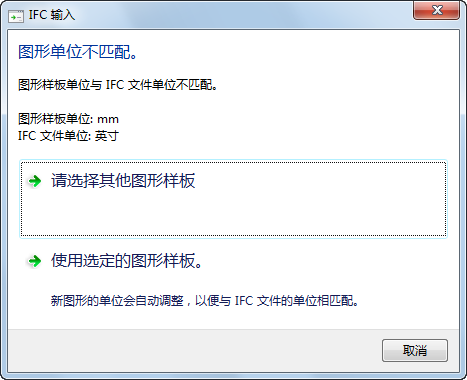 如果选定的样板(DWT 文件)与要输入的 IFC 文件具有不同的单位,系统将让您选择是继续使用该样板还是选择另一个样板。如果您继续使用选定的样板,则 IFC 文件中的单位将替代样板文件中的单位。