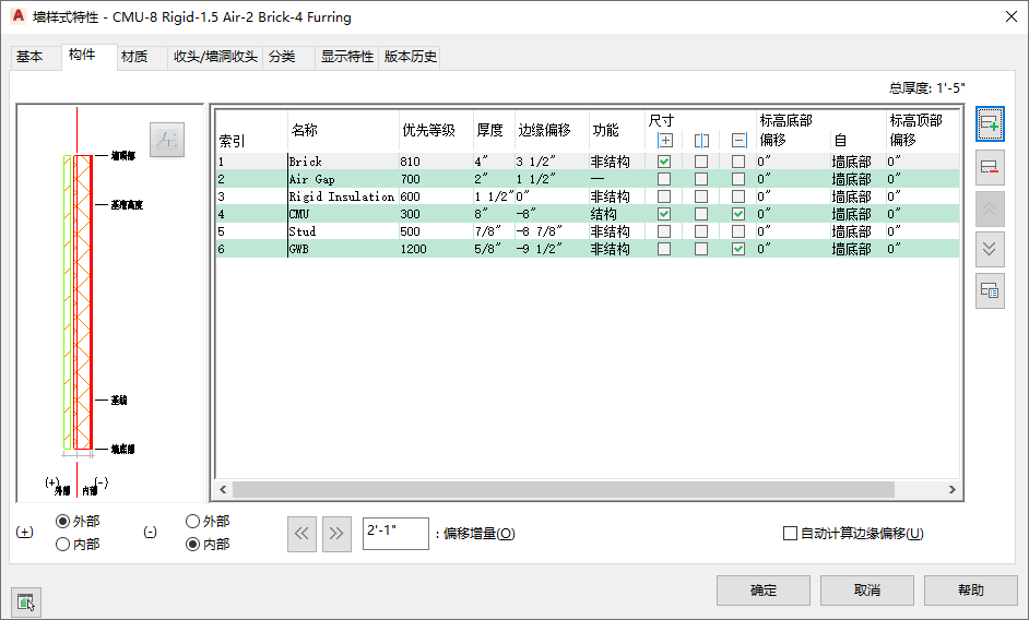 墙样式中的每个构件都对应于墙的结构构件或墙材质,包括空心砖墙上的气隙层。创建墙构件时,指定构件的以下特征: