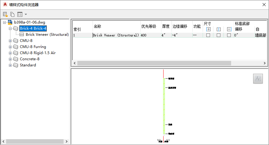 | 浏览器左窗格中的树状结构 | 展开墙样式以查看样式中的构件列表。选择左窗格中的墙样式以查看其构件的特性,并在右窗格中查看墙样式。可以使用关联菜单来复制选定样式的单个构件或所有构件。然后将构件粘贴在您正在编辑的样式。 |