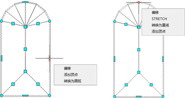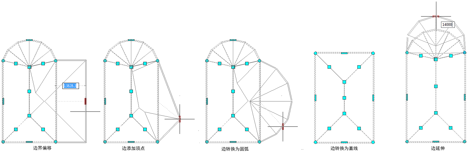 “边缘”夹点有五种编辑模式:“偏移”、“添加顶点”、“转换为圆弧”、“转换为直线”和“拉伸”。