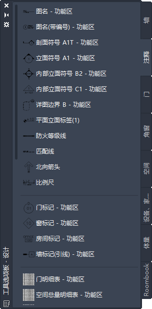 工作台中的默认工具选项板包含一些立面标签工具的样例,您可以根据需要使用和自定义这些工具。此外,随软件提供的下列目录中也包含可添加到工具选项板的立面标签工具: