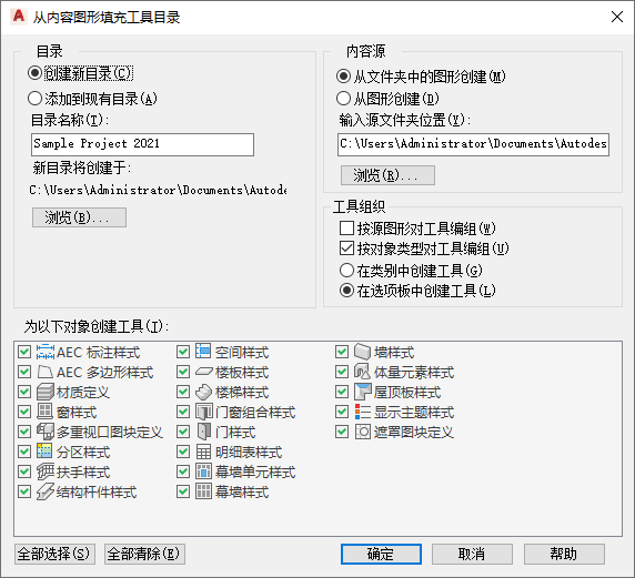 注: 如果同时启用这两个选项,目录将先按图形、再按对象类型编组,从而根据图形生成类别,根据对象类型生成选项板。之所以这样,是因为选项板不能嵌套。在这种情况下,类别和选项板的单选按钮将被禁用,并且将为目录选择“在选项板中创建工具”选项。