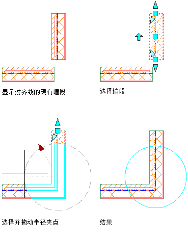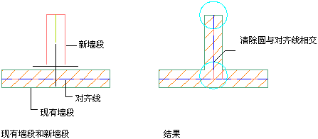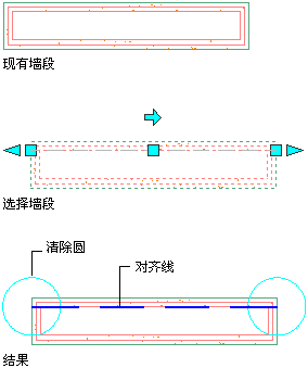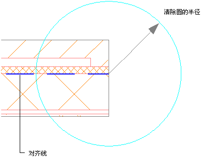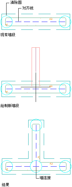 清除圆位于每个墙段的起点和端点。每个清除圆的中心点都是墙对齐线的起点或终点。
