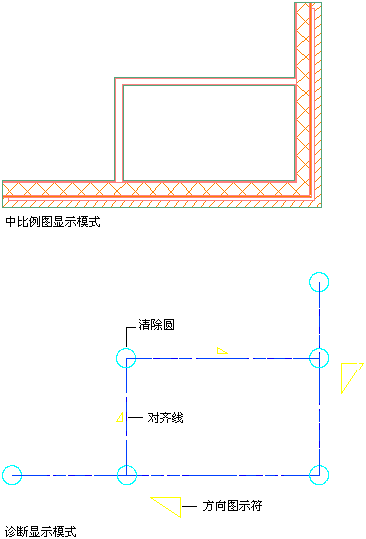 “诊断”显示模式显示墙段的对齐线、清除圆半径和方向轮廓来帮助解决墙清除的问题。在状态栏上,依次单击“单击以修改显示配置”