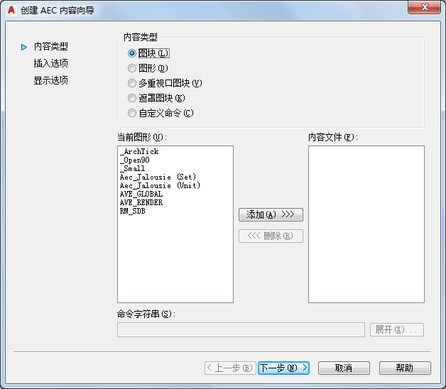 - 如果有现有的二维和三维 AutoCAD 图块,可以通过使用“AEC 内容向导”并选择“图块”作为内容类型,将其直接转换为 AEC 内容。