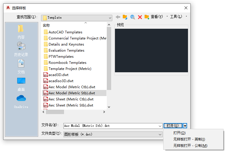 - 在干净的图形中开始。不使用会加载样板的 QNEW 命令,而是使用 NEW 命令,并从“打开”下拉菜单中选择“无样板打开 - 公制”。