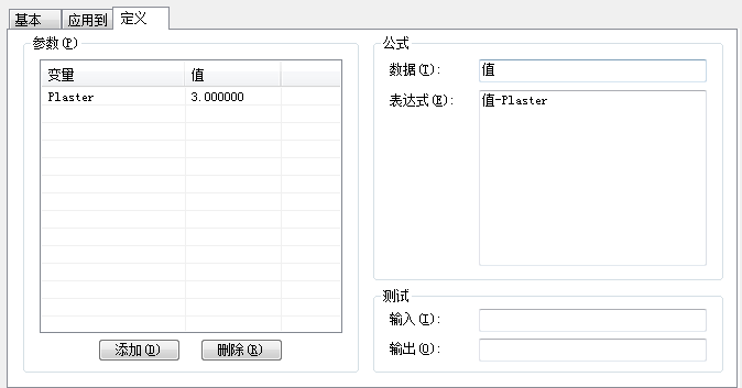 例如,假设需要设置 3% 的灰浆损耗,而且已经定义了一个名为 Plaster_Deduction、值为 0.97 的变量,请输入“AreaValue * Plaster_Deduction”。
