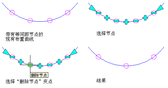 - 如果已从包含相等间距节点的布置曲线中删除了某个节点,将会从指定位置删除该节点,并将重新计算其余节点,以便以相等间距重新放置它们。