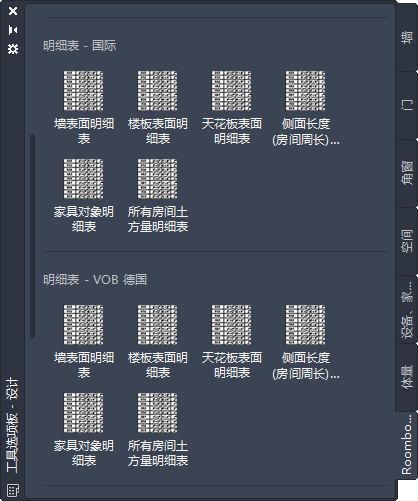工具选项板 Roombook 包含不同的明细表,具体取决于当前的计算标准。该命令被链接到文件