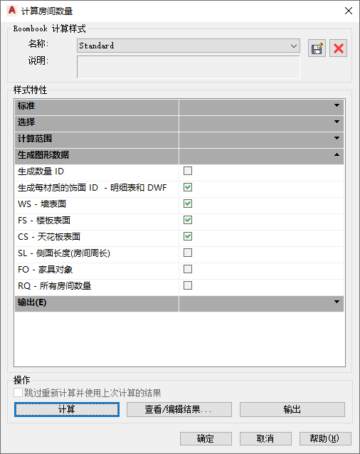 在“计算房间土方量”对话框中,在“样式特性”下的“生成图形数据”列表中,选择“生成每材质的完工 ID”。