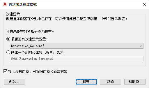 在先前激活的图形中重新激活改建模式后,可以继续使用现有的改建显示配置或创建新的显示配置。
