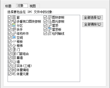 - 单击“对象”选项卡,然后选择要包括在 IFC 文件中的对象。