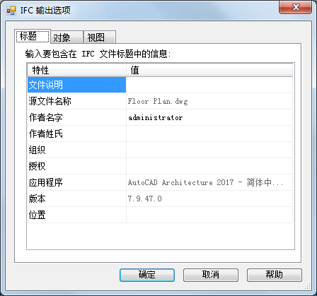 屏幕上处于激活状态的图形的名称将显示在“IFC 输出选项”对话框的“标题”选项卡上。您可以添加有关要输出的图形文件的信息,例如,图形的说明、作者和公司名称、授权数据以及建筑的地理位置。例如,您可以在“标题”选项卡上输入“Structure for Commercial Building 152”作为结构图形的说明。在查看 IFC 文件时,此信息会显示在该 IFC 文件的标题中。