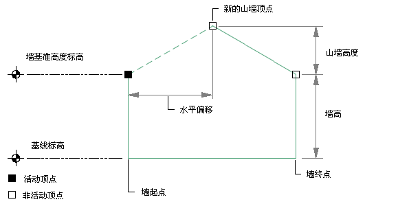 使用以下步骤可以将山墙添加到墙的屋顶线。您也可以在“特性”选项板上的“屋顶线/楼板线”工作表中添加山墙。