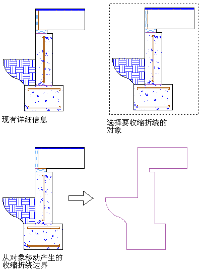 使用以下步骤可在相邻线条图元(包括建筑对象)组成的任意集合周围,自动创建轮廓或包络处理轮廓。此过程的视觉效果类似于合并图元,但在这种情况下,创建的轮廓是可以单独选择的图元。与其他 AEC 线条工具不同,可从“常规”工具选项板访问包络处理工具。该工具调用的 AECLINEWORKSHRINKWRAP 命令位于设计中心命令中以便适应图层索引,即,使用此工具创建的包络处理多段线将自动放置在关联图层索引指定的特定图层上。