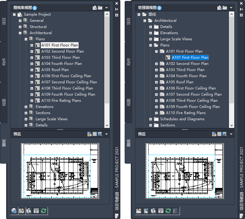 含项目“图纸集视图”(左)和“管理器视图”(右)的“图纸”选项卡