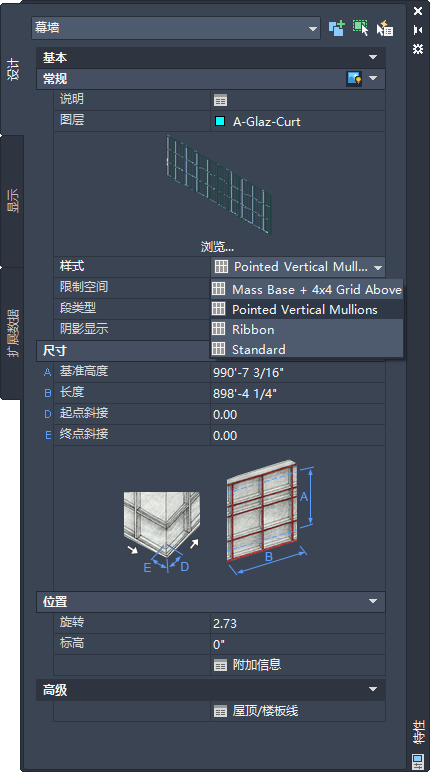 执行以下步骤可以在“特性”选项板上为幕墙选择另一样式。