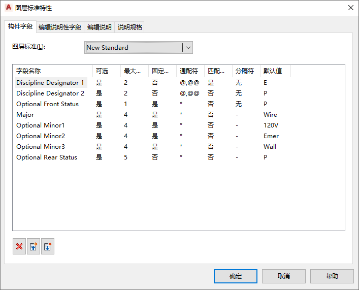 每个图层标准都定义了构成图层名称的构件字段的数目,并针对每个字段中所允许的内容指定了规则。如果创建或编辑图层标准,可以访问图层标准特性来编辑构件字段。