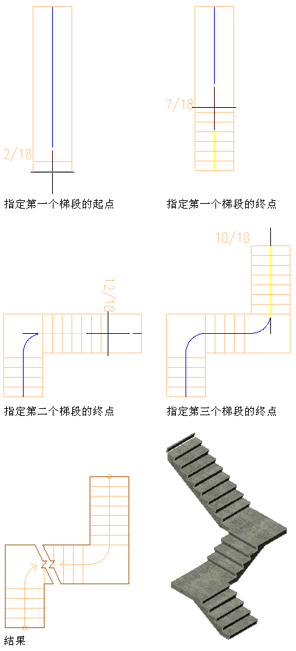 | 创建整个长度方向上都有踏步的楼梯,在任何方向上都具有一个或一个以上的转角 | 在“转角类型”中选择 1/4 转角。 注: 这种楼梯可能有两段或两段以上,角点可以转向任一方向。