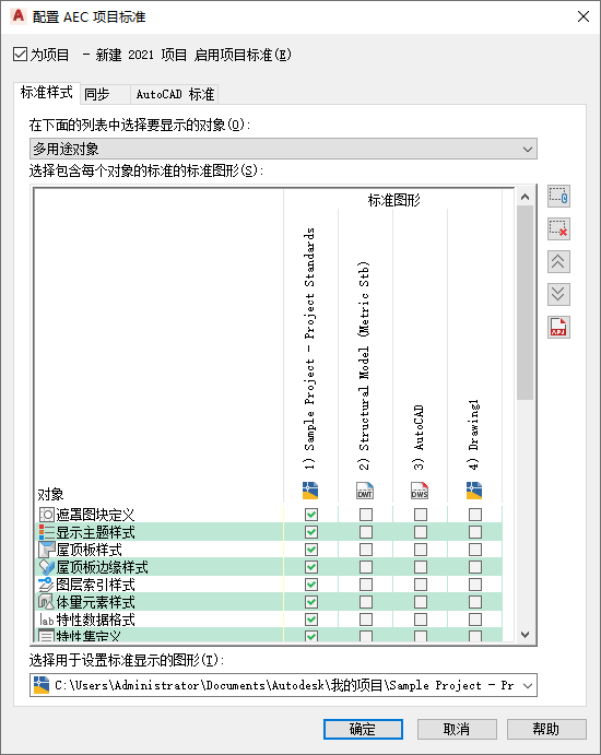 若要设置标准样式和显示设置,则需定义一个或多个包含样式和显示设置标准的项目标准图形。这些图形可以是 DWG、DWT 或 DWS 文件,并已添加到配置对话框中。