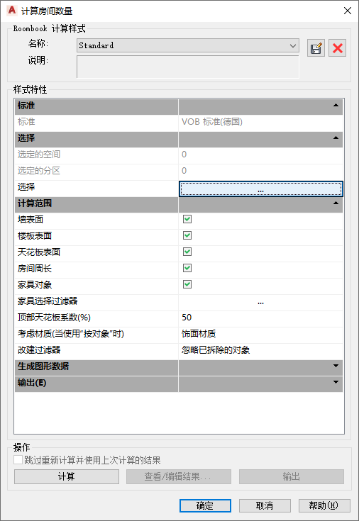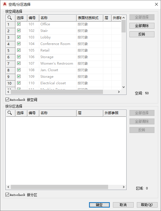 - 将列出图形的所有空间。显示应用的表面材质样式。默认情况下,将选定包含在计算中的所有空间。如果不要计算空间,请清除该复选框。