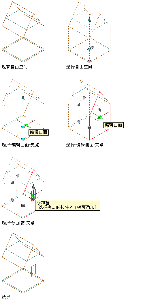 若要添加门,请按住 Ctrl 键,同时单击“添加窗”夹点。请注意,门被定位于选定曲面的底部。