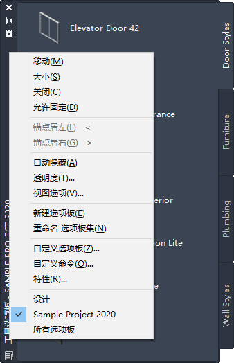 可用选项板组下会列出项目工具选项板编组,并且该选项板组是可选的。