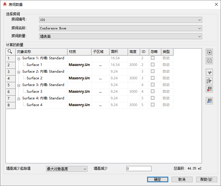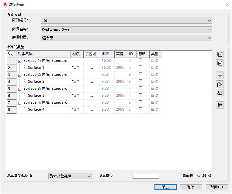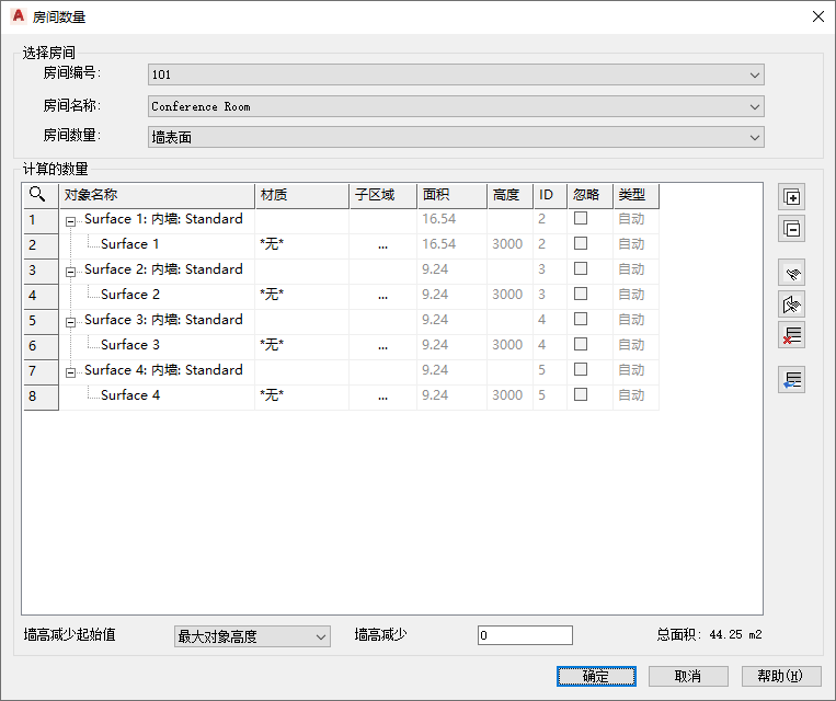 将列出属于选定房间的所有墙表面。将为每个对象和面显示高度。
