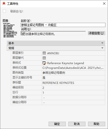| 表格样式 | 指定注释记号图例的 AutoCAD 表格样式。可能值包括“参照注释记号图例”、“图纸注释记号图例”和“标准”。如果该特性为“未指定”(--),将使用图形的当前表格样式。 |