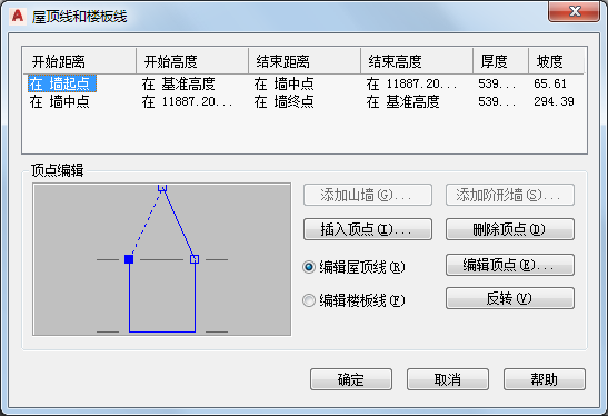 屋顶线的两个终点中央将添加第三个顶点。