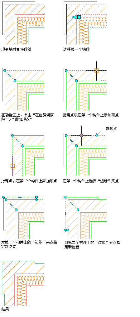 使用些过程可以通过在构件边缘上面或附近添加一个顶点来修改墙交点。在为构件边缘添加顶点后,可以通过更多的选项来编辑其造型。