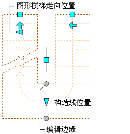 U 形楼梯的“图形楼梯走向位置”、“构造线位置”和“编辑边缘”夹点