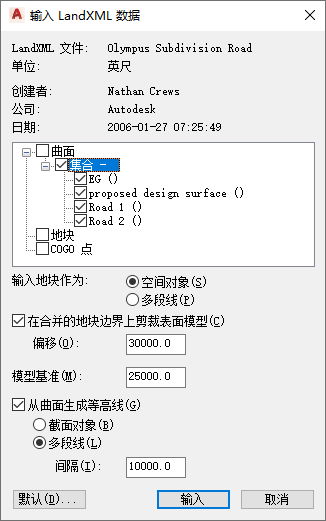 注: LandXML 文件包含有关作为其度量单位的图形单位的信息。在将 LandXML 文件输入具有不同单位的图形时,LandXML 数据会转换为当前 DWG 中的单位。在将基于公制单位的 LandXML 文件输入到基于毫米的图形中时,所得到的坐标可能会超出范围而无法进行准确的计算。