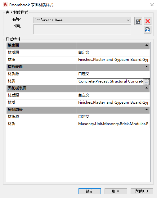 - 在“Roombook 表面材质样式”对话框中,创建或编辑现有表面材质样式或从目录加载表面材质样式。