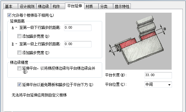 在添加或修改楼梯时,指定梯边梁精度和延伸尺寸(例如距第一级上行踏步的距离以及距第一级下行踏步的距离) 选中“允许每个楼梯各不相同”。