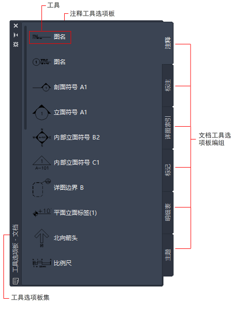 工具选项板集包含工具选项板的编组。可以重命名默认的工具选项板集,或创建自定义工具选项板集。也可以在集中添加、删除和重新排列选项板和编组。