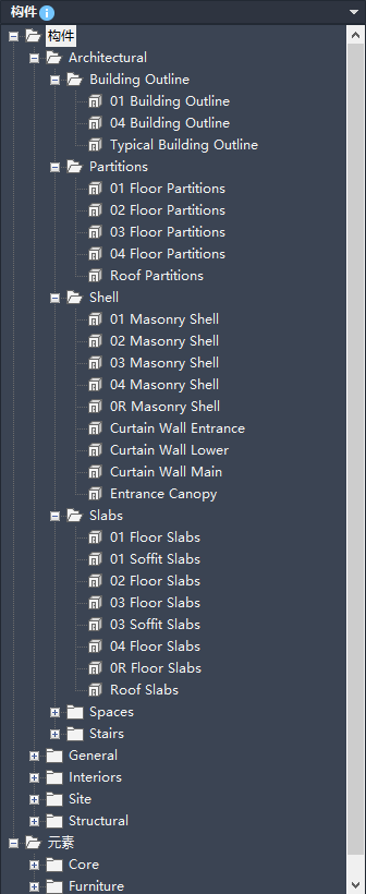 图形管理器是“项目导航器”的“构件”、“视图”和“图纸”公用的树视图。也可以在此组织图形文件。“项目导航器”的每个选项卡(除“项目”选项卡之外)都具有显示关联项目图形文件(元素、构件、视图和图纸)的树状图。