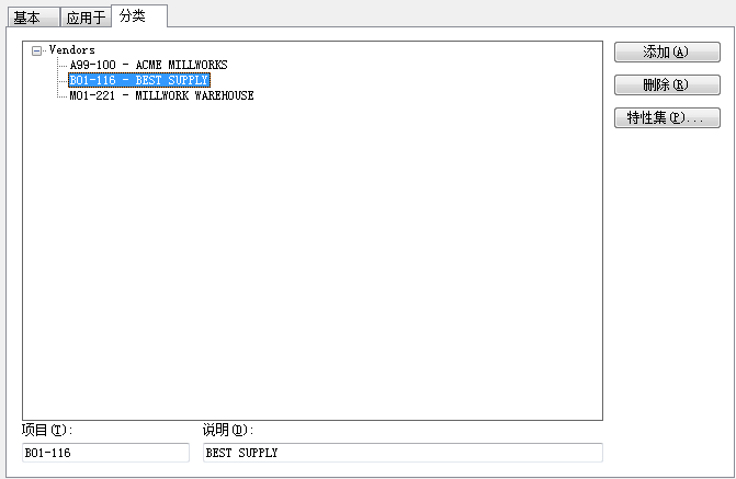 例如,如果为供应商创建分类定义,可以将特性集附着至每个供应商分类中。特性集中可以包含您指定的任何特性,例如供应商专用的构件号。特性随即与应用分类的各个对象相关联。然后,在编制对象明细表时这些特性可以包含在明细表中。