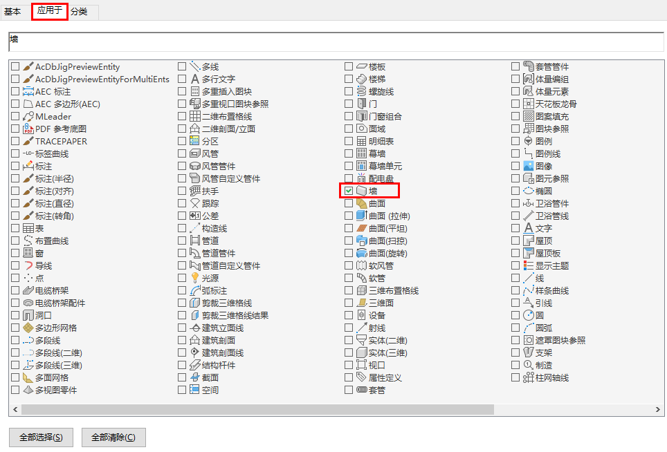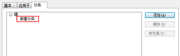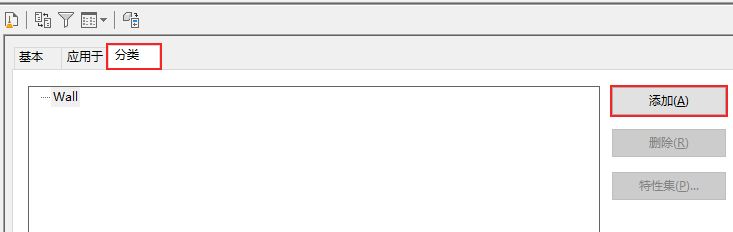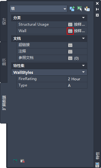 在“特性”选项板中,在“扩展数据”选项卡上的“分类”下,单击“墙”旁边的按钮。