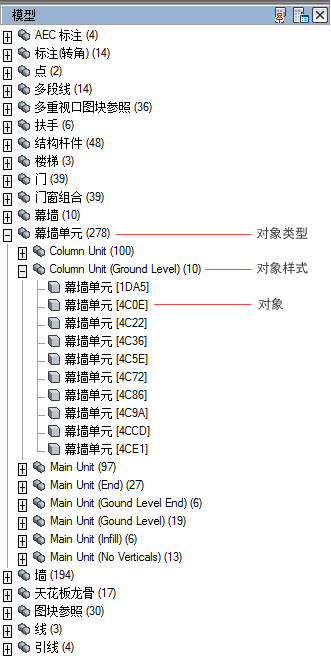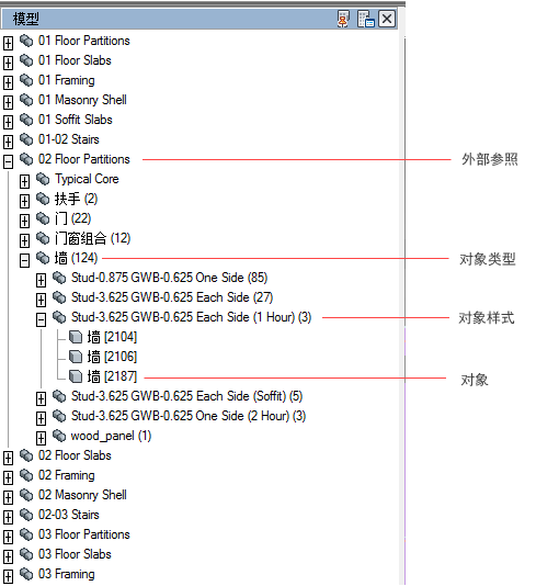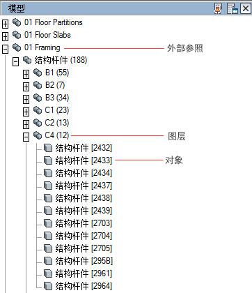 先按外部参照后按对象类型和对象样式对特性集数据进行编组: