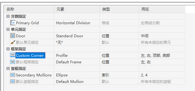 创建门窗组合样式的元素定义后,可以将这些定义指定给每一种门窗组合元素类型:分割、单元内嵌、框架和竖挺。