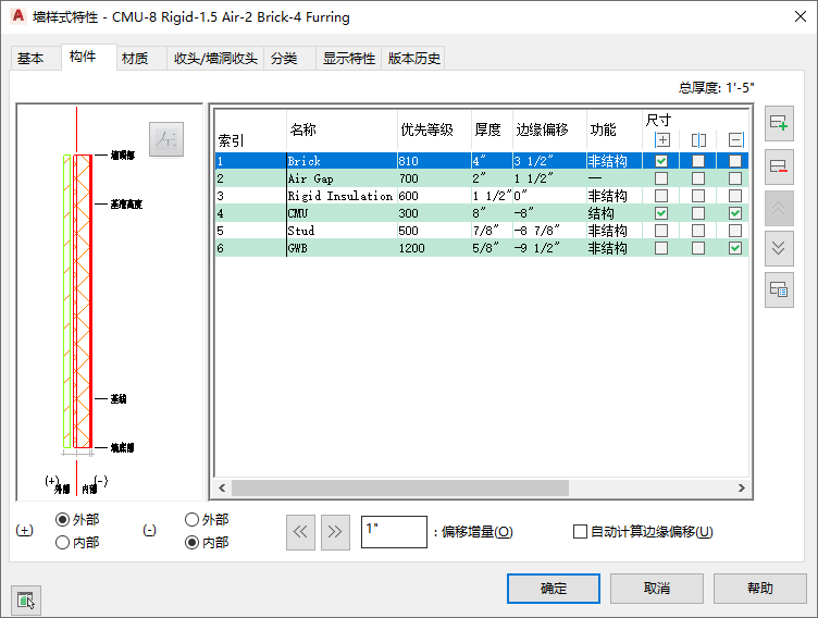 应当在名称中提供尽可能多的关于墙结构的信息。这样无需参照墙样式的说明,即可轻易区别长列表中的各个墙样式。列出的第一个构件是主结构构件。列出的最后一个构件是完工构件。