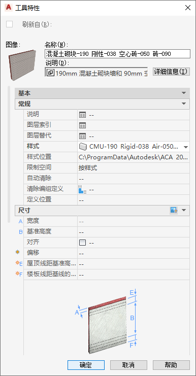 唯一可以指定给基于选项板工具的基于墙的样式是墙样式自身。但是,在使用墙样式时,它所使用的任何子样式(如墙收头样式和墙洞收头样式)将随它自动输入。另外,在将工具保存到目录之前,您可能希望将一些工具特性设置为默认值。