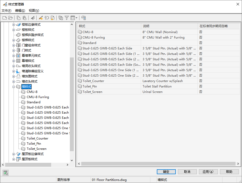 样式分为 3 种类别:建筑对象(如门样式)、文档对象(如明细表样式)以及多用途对象(如图层索引样式)。在每一类别中,样式按照字母顺序排列。若要过滤树状视图,以便仅显示一种样式类型的样式,请选择所需的样式类型,然后在样式管理器工具栏上单击
