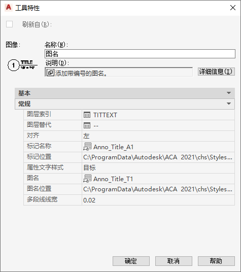 | 名称 | 常规 | 为该工具创建的模型空间视图设置一个默认名称。可在图形中插入详图索引期间替代在工具中设置的名称。 |