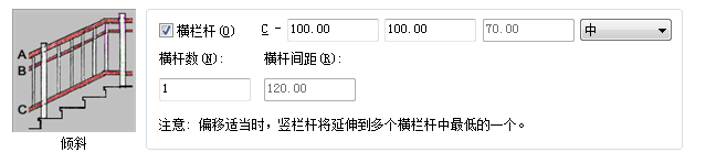指定多个横栏杆 输入“扶手数”值。指定多个横栏杆时,可输入“扶手间距”值。