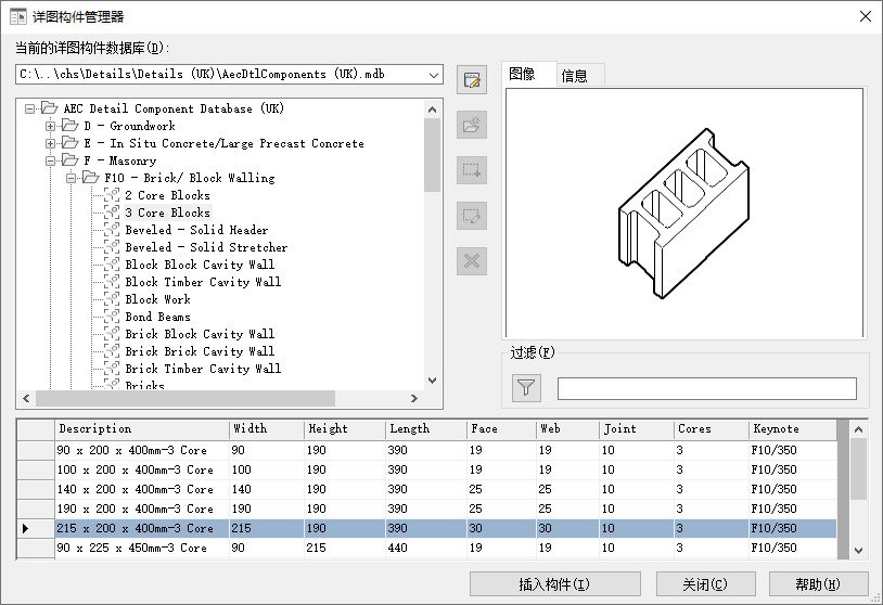 3. 浏览树状视图,或使用过滤机制在对话框底部显示表中的所需详图构件。(若要查看大型构件表的完整内容,可以使用表右侧的垂直滚动条进行浏览。)