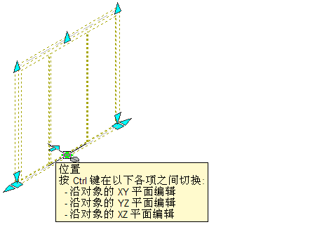 在“模型”视图中,“位置”夹点有三种可能的编辑模式:“沿对象的 XY 平面编辑”、“沿对象的 YZ 平面编辑”和“沿对象的 XZ 平面编辑”。按 Ctrl 键在模式之间切换,直到进入所需模式为止。默认编辑模式是沿着 XY 平面。在“平面”视图中,“位置”夹点被限制为在一个平面内移动。