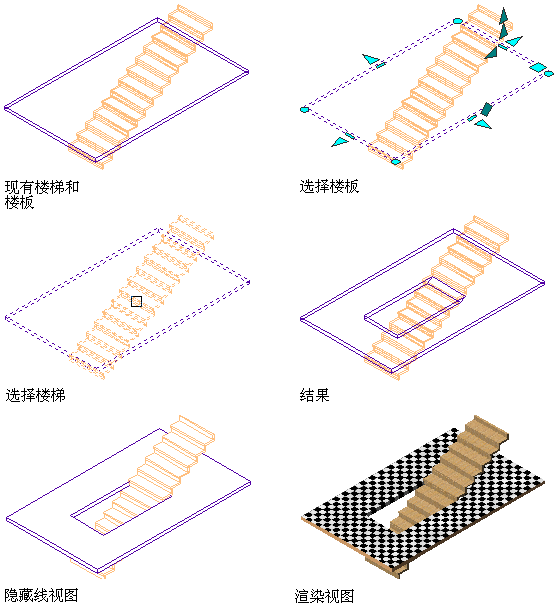 使用以下步骤可以在楼板中创建楼梯干涉区域。在楼梯和楼板之间添加干涉条件后,将根据指定的梯段净空高度与左间隙和右间隙(对于直跑楼梯和多向平台楼梯来说)或者内间隙和外间隙(对于螺旋楼梯和 U 形楼梯来说),在楼梯周围切割出一个长方体。