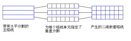 嵌套格线时,请从一条主要格线开始。然后可以使用其他格线来填充主要格线中的每个单元。例如,如果主要格线是水平的并有三个单元,则可以在每个水平单元中嵌套垂直格线,以创建简单的二维 (2D) 格线。这是“标准”幕墙样式的嵌套配置。